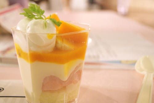 マンゴーとバナナにマンゴーソース、バニラムース(?)、甘酸っぱいベリームース、スポンジの順に重なっていたと思います。